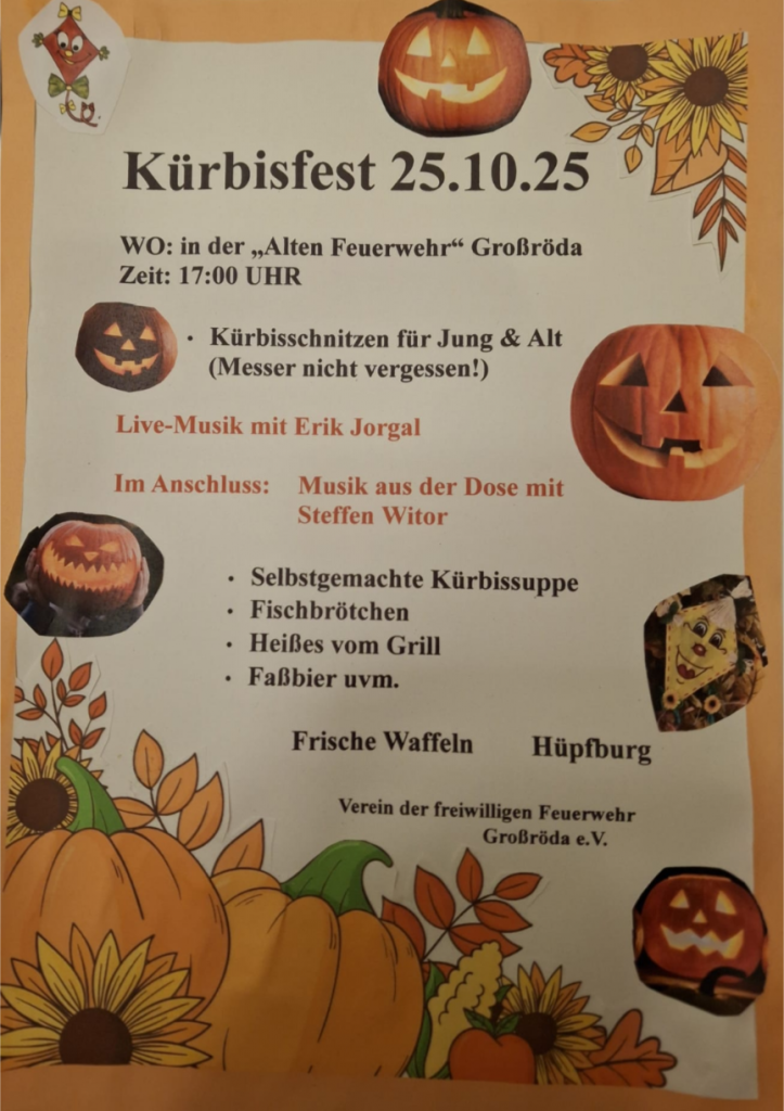 Kürbisfest 2025 in Großröda Am 25.10.2025 findet an der „Alten Feuerwehr“ Großröda das Kürbisfest statt